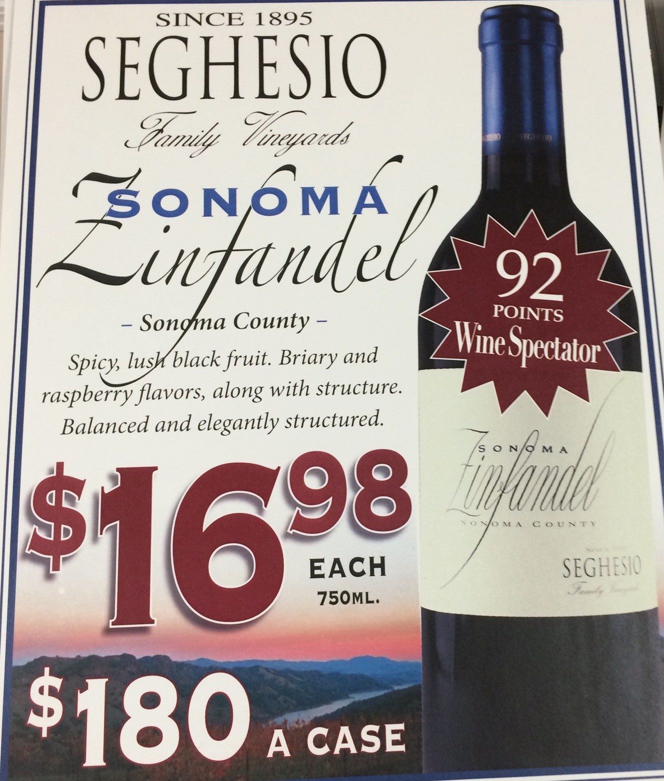 This has been one of the best Zins I have tried as of late, but if you consider the price it would be the best Zin I have tried in a while. The Seghesio Zinfandel Sonoma normally sells for $22.99 per bottle, we currently have it at our Super Savers price of $16.98, but if you buy it by the case you only pay $180 for the case ($15/bottle). You just can’t beat that price. But act quickly because this wine will sell out fast. Carpe Vinum!