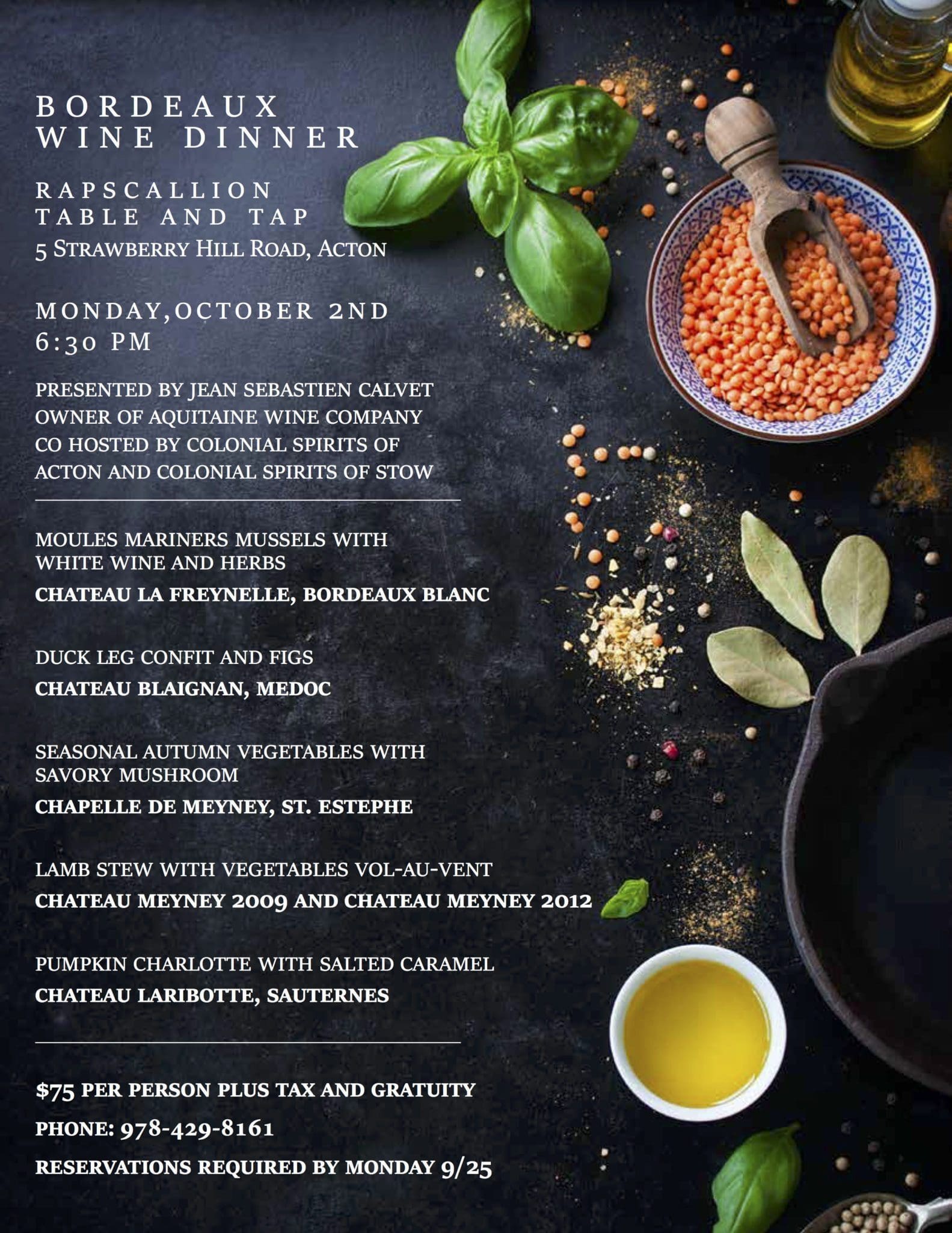 Rapscallion is one of the kings of local, fresh food. Aquitane is one of the best-known importers of Bordeaux. These are NOT your average food and wine pairings, folks. Don’t miss out on this huge opportunity.