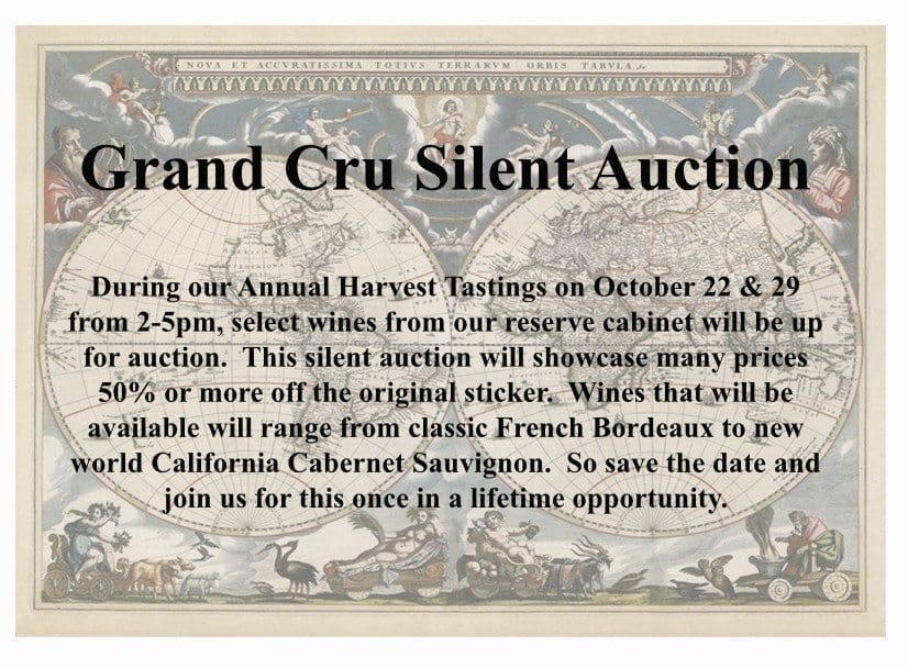 During our Annual Harvest Tastings on October 22 & 29 from 2-5pm, select wines from our reserve cabinet will be up for auction. This silent auction will showcase many prices 50% or more off the original sticker. Wines featured at the auction will range from classic French Bordeaux to new world California Cabernet Sauvignon. So save the date and join us for this once in a lifetime opportunity.