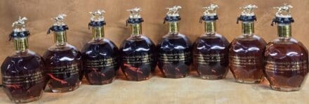 8 bottles of Golden-horse topped Blanton’s Gold that make up the entire set of toppers is a prize. Of course these are full bottles, so you can enjoy 8 delicious bottles of bourbon and mount your collectible toppers or just keep the lineup as a show piece on your bar. The included bottles may or may not be in boxes and are not necessarily from the same barrel and/or dump date. There is no special packaging, just 8 sweet bottles of Blanton’s Gold with all 8 golden letters and horses (and, yes the two ‘N’s are different).