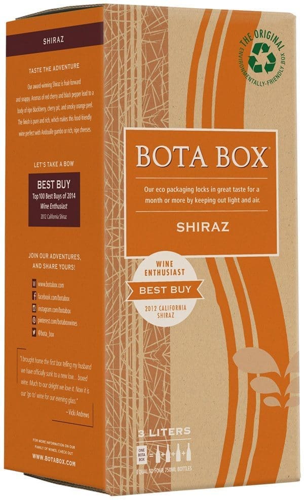 Bota Box Shiraz remains true to character with complex aromas of spice, blackberry, and red cherry. On the palate, this wine has a soft, supple mouthfeel with flavors of blueberries, spice, and oak nuances that lead into a lingering finish.