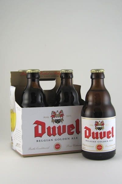 4 pack – Belgian Golden Ale. Duvel, Dutch for Devil, is gold colored with a silky taste brewed to associate with the tradition of great pilsners. A refined taste and complexes aromas hide the 8.5% alcohol content.
