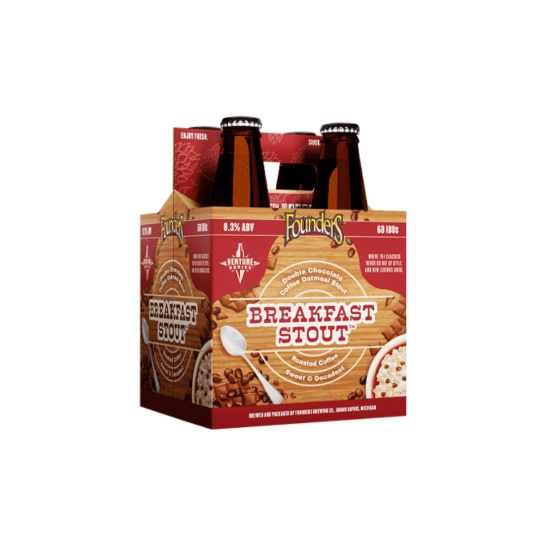 Founders Breakfast Stout is an English Oatmeal Stout. It’s full of chocolate and coffee notes, and packed with robust, bitter flavors. These 12oz bottles are 8.3% ABV.