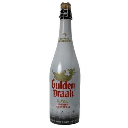 750ml – Belgian Tripel. Gulden Draak is a dark brown Triple Ale, which makes it an exception among the Belgian Triples. The second fermentation offers the nice creamy head, the full body and all the vitamins of the centuries old brewers yeast. It is a ‘thick’ beer, that you can actually ‘eat’ to adventure the complex taste. Gulden Draak balances a natural malt toffee-like sweetness with a mellow happiness and some hoppy accents. The aroma is round, sweet and reveals the 10.5 alcohol by volume. Another name for this type of rich beer is: ‘Barley wine’. You sip and enjoy this beer slowly, probably as a dessert, or as a treat you definitely deserve. FOOD-COMBINATIONS: Dessert-beer after dinner. Or just before bed. Some like it with a cigar, others match it with chocolate. Sealed from light in the white painted bottle, which is recycled as candle-holder. You can age the Gulden Draak for many years, just like wine.