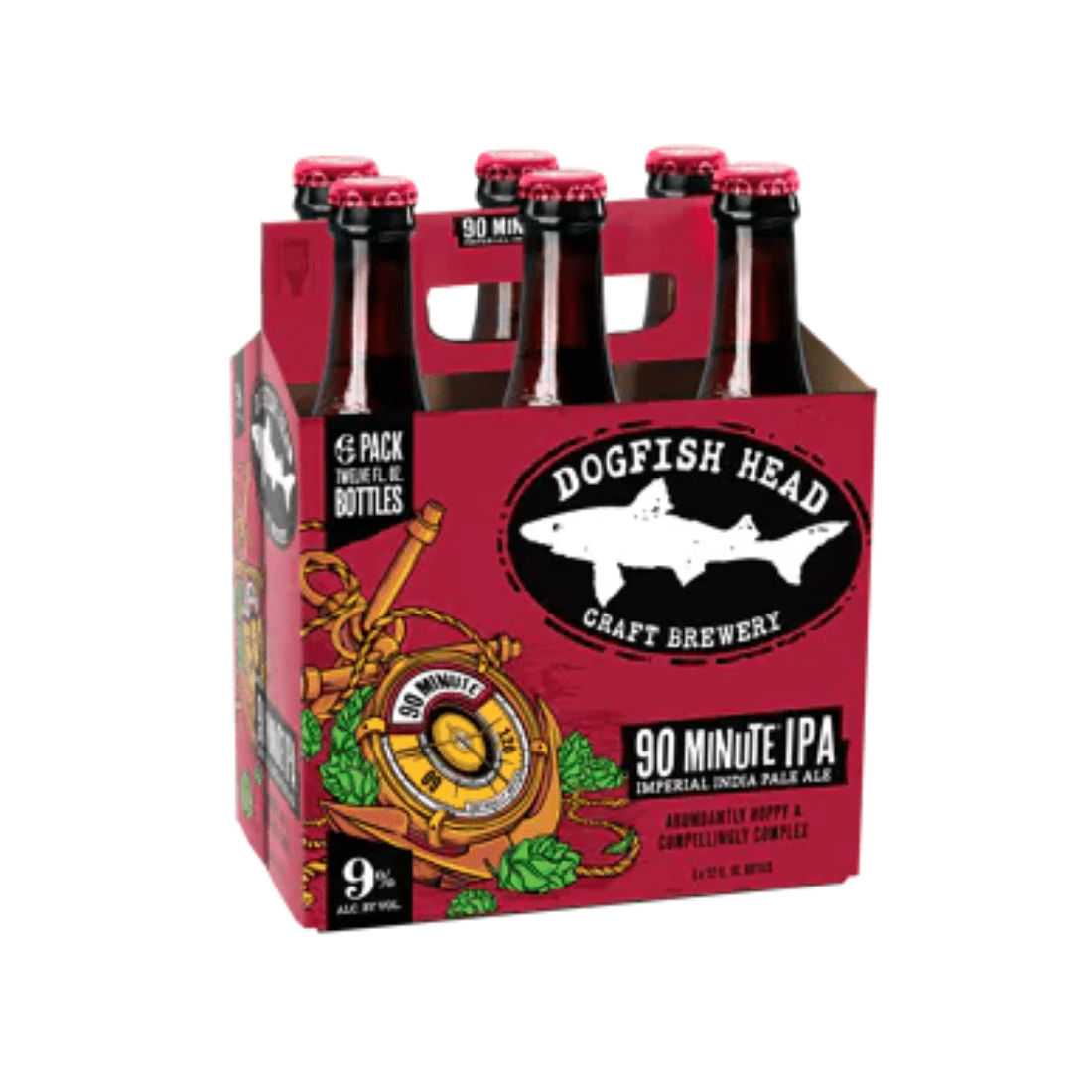Dogfish Head 90 Minute IPA is an intense IPA. It has flavors of brandied fruitcake, raisins, and citrus. These 12oz bottles are 9% ABV. Food Pairing recommendations: Pork chops, beef, grilled fish, frites, focaccia, split pea soup, Stilton cheese , and escargot.