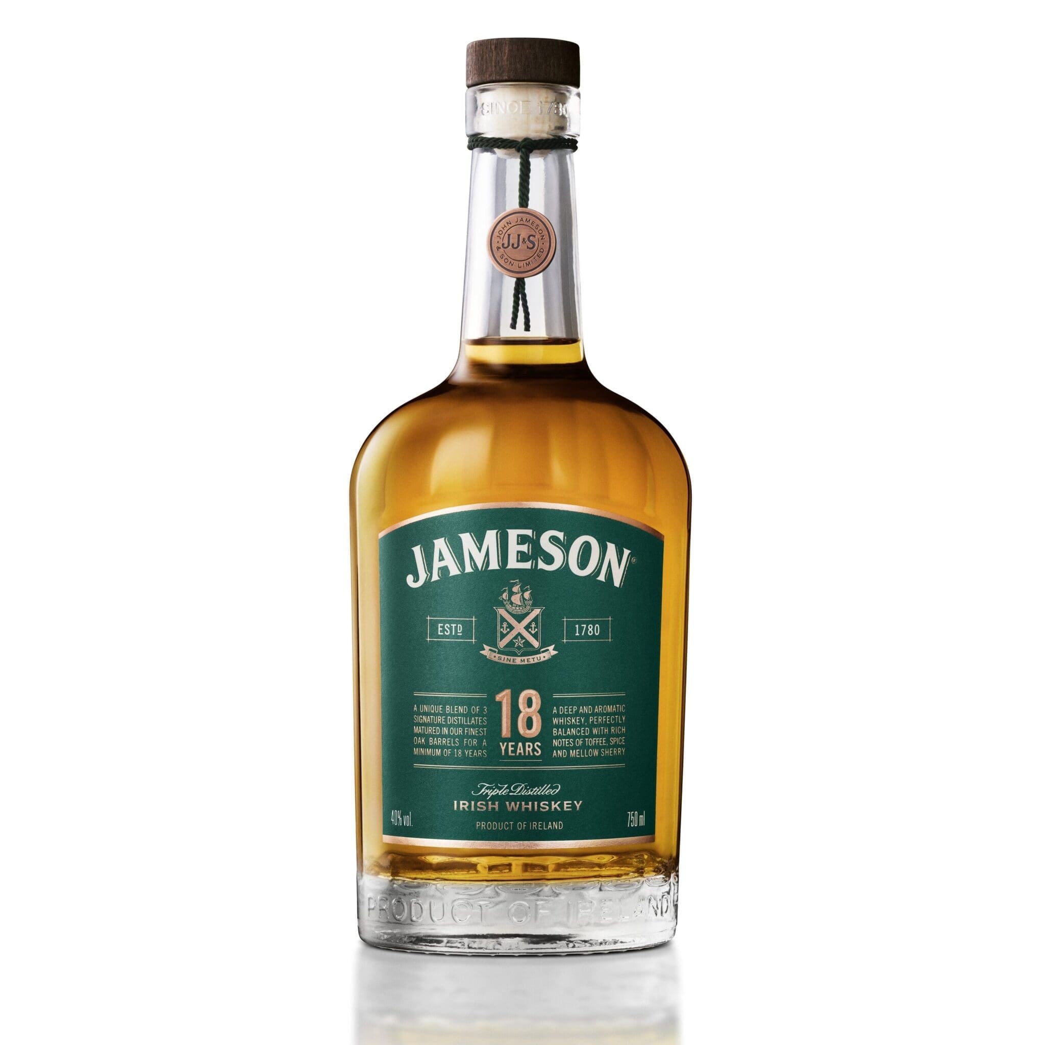 Jameson 18 Year Old is the Master Blender’s supreme example of the Jameson tradition of maturing whiskey in Spanish oloroso sherry casks. The Master Blender has hand-picked three Irish whiskeys which have been matured in seasoned olorosso sherry casks for at least 18 years. Then Jameson 18 Year Old is transferred to American bourbon barrels for a further six months, to put the final finishing touches to this unique and complex whiskey.
