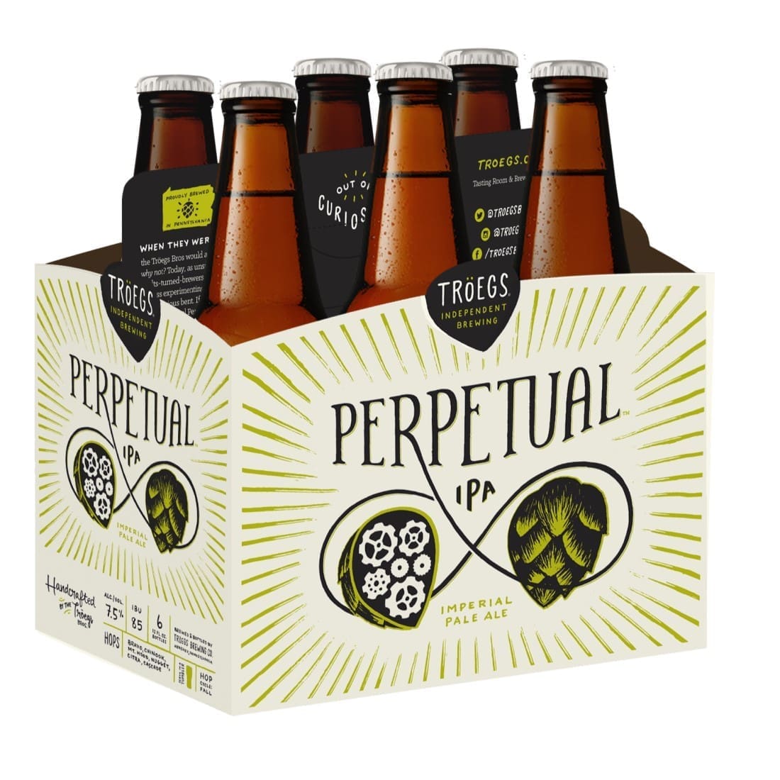 Troeg’s Perpetual IPA is an imperial pale ale. It’s full of citrus and pine, and backed with a healthy dose of malt. These 12oz bottles are 7.5% ABV.