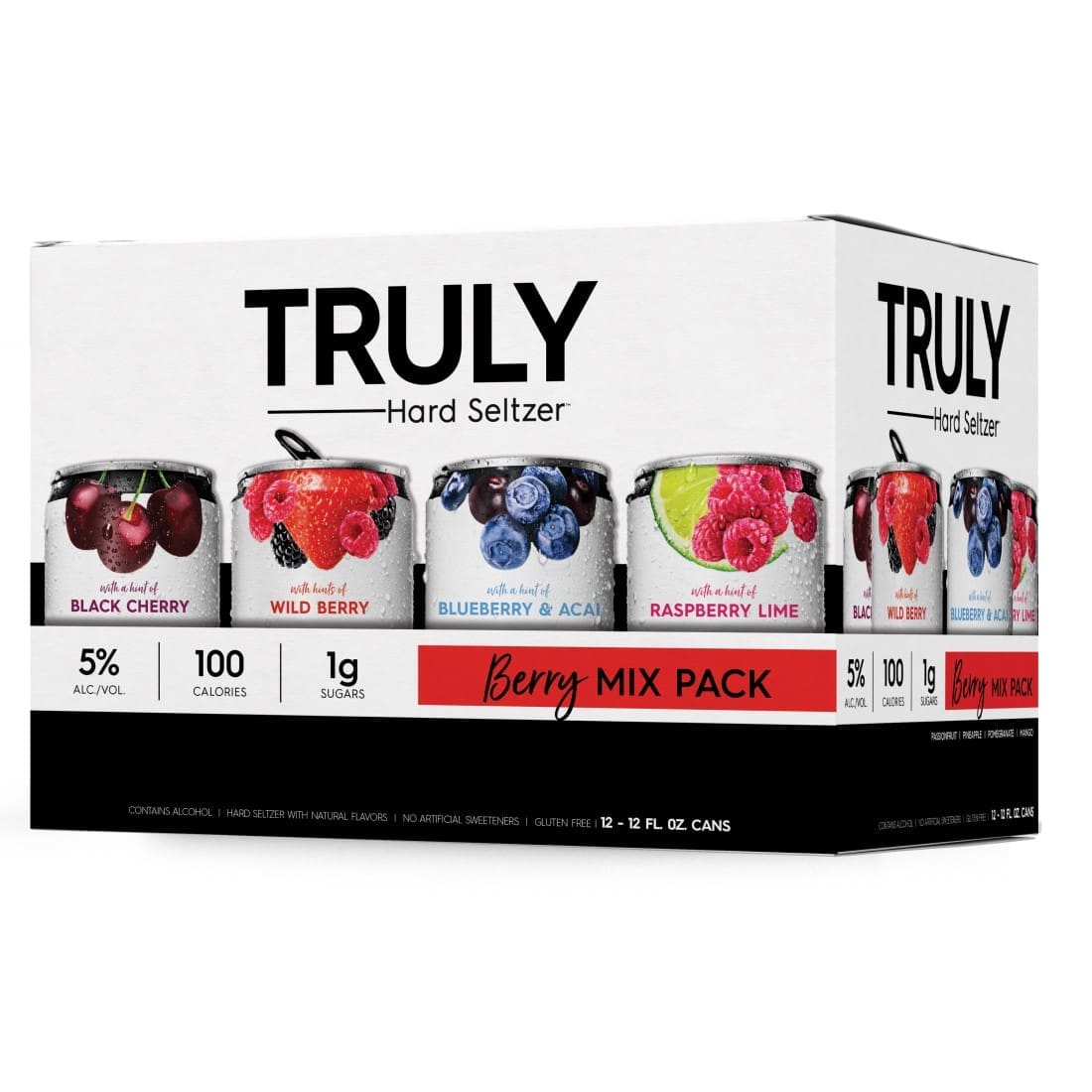 Truly Seltzer Mix 12 pack includes; black cherry, wild berry, blueberry acai, raspberry lime. A great light sipper that is 5% ABV, 100 calories, 1 gram sugar, and gluten free.